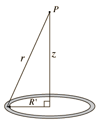 Potential for Ring of ChargeThe potential of a ring of charge can be found by superposing the point charge potentials of infinitesmal charge elements. It is an example of a continuous charge distribution. The ring potential can then be used as a charge element to calculate the potential of a charged disc.