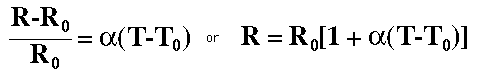 Resistance: Temperature CoefficientSince the electrical resistance of a conductor such as a copper wire is dependent upon collisional proccesses within the wire, the resistance could be expected to increase with temperature since there will be more collisions. An intuitive approach to temperature dependence leads one to expect a fractional change in resistance which is proportional to the temperature change: ![]() Or, expressed in terms of the resistance at some standard temperature from a reference table: ![]()