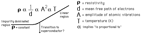 Low Temperature ResistivityThe temperature dependence of resistivity at temperatures around room temperature is characterized by a linear increase with temperature. Microscopic examination of the conductivity shows it to be proportional to the mean free path between collisions (d), and for temperatures above about 15 K, d is limited by thermal vibrations of the atoms. The general dependence is summarized in the proportionalities: ![]() At extremely low temperatures, the mean free path is dominated by impurities or defects in the material and becomes almost constant with temperature. With sufficient purity, some metals exhibit a transition to a superconducting state. |