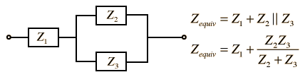 Series-Parallel CombinationMost networks in AC circuits can be broken into blocks no more complicated than the one below. The complex impedance approach provides the tool necessary to reduce such a combination to an equivalent impedance. This kind of combination may be encountered in the development of an AC Thevenin equivalent for the analysis of an AC circuit.