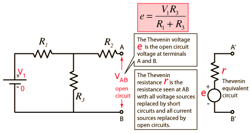 Thevenin's TheoremAny combination of batteries and resistances with two terminals can be replaced by a single voltage source e and a single series resistor r. The value of e is the open circuit voltage at the terminals, and the value of r is e divided by the current with the terminals short circuited. ![]()