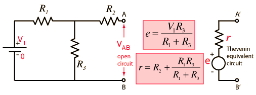 Thevenin Example Replacing a network by its Thevenin equivalent can simplify the analysis of a complex circuit. In this example, the Thevenin voltage is just the output of the voltage divider formed by R1 and R3. The Thevenin resistance is the resistance looking back from AB with V1 replaced by a short circuit.