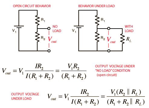 The two resistor voltage divider is used often to supply a voltage different from that of an available battery or power supply. In application the output voltage depends upon the resistance of the load it drives.
