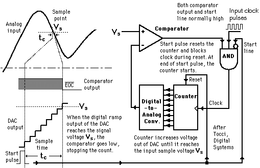 Conversion from analog to digital form inherently involves comparator action where the value of the analog voltage at some point in time is compared with some standard. A common way to do that is to apply the analog voltage to one terminal of a comparator and trigger a binary counter which drives a DAC. The output of the DAC is applied to the other terminal of the comparator. Since the output of the DAC is increasing with the counter, it will trigger the comparator at some point when its voltage exceeds the analog input. The transition of the comparator stops the binary counter, which at that point holds the digital value corresponding to the analog voltage.