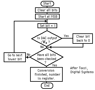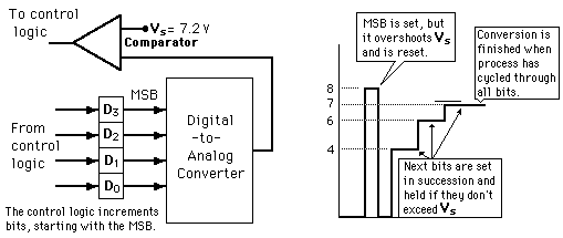 This is a sample of the large number of analog-to-digital conversion methods. The basic principle of operation is to use the comparator principle to determine whether or not to turn on a particular bit of the binary number output. It is typical for an ADC to use a digital-to-analog converter (DAC) to determine one of the inputs to the comparator.