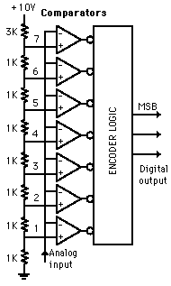 Illustrated is a 3-bit flash ADC with resolution 1 volt (after Tocci). The resistor net and comparators provide an input to the combinational logic circuit, so the conversion time is just the propagation delay through the network - it is not limited by the clock rate or some convergence sequence. It is the fastest type of ADC available, but requires a comparator for each value of output (63 for 6-bit, 255 for 8-bit, etc.) Such ADCs are available in IC form up to 8-bit and 10-bit flash ADCs (1023 comparators) are planned. The encoder logic executes a truth table to convert the ladder of inputs to the binary number output.