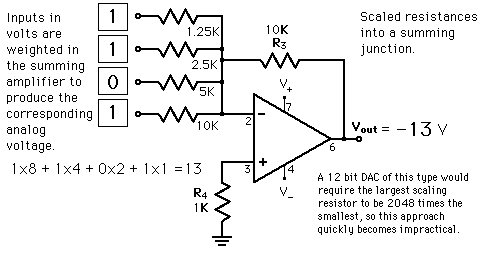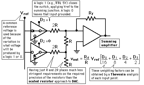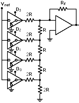 Digital-to-Analog ConversionWhen data is in binary form, the 0's and 1's may be of several forms such as the TTL form where the logic zero may be a value up to 0.8 volts and the 1 may be a voltage from 2 to 5 volts. The data can be converted to clean digital form using gates which are designed to be on or off depending on the value of the incoming signal. Data in clean binary digital form can be converted to an analog form by using a summing amplifier. For example, a simple 4-bit D/A converter can be made with a four-input summing amplifier. More practical is the R-2R Network DAC.