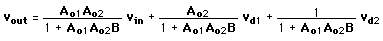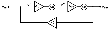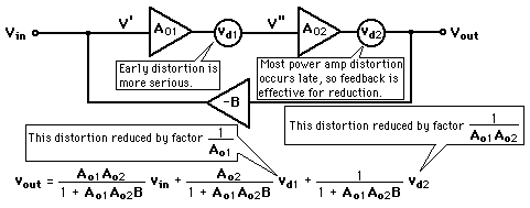 Decreasing Distortion with FeedbackThe use of negative feedback can discriminate against sources of noise or distortion within an amplifier. Considering a two-stage amplifer (after Simpson) with sources of distortion vd1 and vd2 inside the feedback loop. ![]() ![]() Distortion reduction takes the form below for this amplifier, showing that distortion within the feedback loop is discriminated against, with more reduction of distortion which arises near the output. ![]()