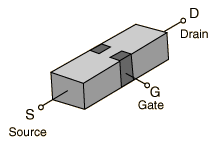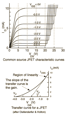 Since the Gate junction is reverse biased and because there is no minority carrier contribution to the flow through the device, the input impedance is extremely high. The control element for the JFET comes from depletion of charge carriers from the n-channel. When the Gate is made more negative, it depletes the majority carriers from a larger depletion zone around the gate. This reduces the current flow for a given value of Source-to-Drain voltage. Modulating the Gate voltage modulates the current flow through the device. |
