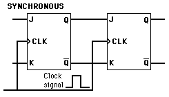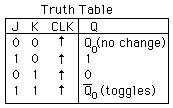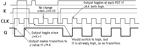 If J and K are both low then no change occurs. If J and K are both high at the clock edge then the output will toggle from one state to the other. It can perform the functions of the set/reset flip-flop and has the advantage that there are no ambiguous states. It can also act as a T flip-flop to accomplish toggling action if J and K are tied together. This toggle application finds extensive use in binary counters.