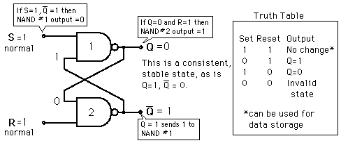 The concept of a "latch" circuit is important to creating memory devices. The function of such a circuit is to "latch" the value created by the input signal to the device and hold that value until some other signal changes it.