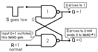 The time sequence at right shows the conditions under which the set and reset inputs cause a state change, and when they don't.