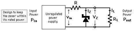 Zener Regulator DesignOne strategy for designing a Zener regulator circuit is to design for a maximum power dissipated in the zener diode when the regulator is open circuited. ![]() The logic of this design strategy is to protect the zener diode. The designed resistor limits the current so that you don't burn out the zener diode if the load resistor gets disconnected. Calculation note: You may substitute values for the zener voltage, the maximum power, the input voltage, or the load resistor. The other parameters will be calculated. Default values will be entered for unspecified parameters used in the calculation. If you experiment with the input values, you will discover some of the practical truths about zener-regulated power supplies. If you start with an unregulated power supply which is closer to, but not less than, the zener voltage, you will be able to get more regulated power out without open-circuit risk to the zener diode. The circuit will also be more efficient in power use.