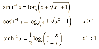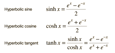 Hyperbolic FunctionsThe hyperbolic functions can be defined in terms of exponentials. ![]() There are closed-form expressions for the inverse hyperbolic functions: ![]() An application of the hyperbolic tangent is in calculating the speed of ocean waves. The hyperbolic cosine and its inverse are encountered in fluid friction in the case of quadratic drag. |