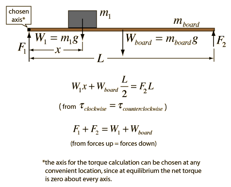 Supporting an Extended LoadFor an extended system to be at equilibrium, the sum of the forces must be equal to zero and the sum of torques about any axis must equal zero. It is logical to choose one of the ends as the axis since that eliminates one of the unknown forces (lever arm = zero). Considering a long uniform wooden board, note that the mass of the board can be considered to be concentrated at its center of mass for the purposes of calculating torque. For a uniform board, the center of mass is at its geometrical center, so the lever arm with respect to either end of the board will be L/2. Choosing the left end as the axis, the torque and force equilibrium equations are shown below. ![]() |