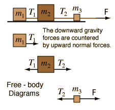 Once the acceleration is determined, the masses may be isolated one by one to determine the tensions T1 and T2.