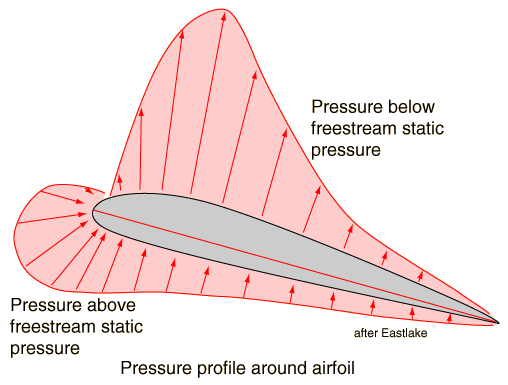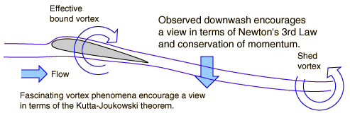 Bernoulli or Newton's Laws for Lift?Which is best for describing how aircraft get the needed lift to fly? Bernoulli's equation or Newton's laws and conservation of momentum? This has been an extremely active debate among those who love flying and are involved in the field. If the question is "Which is physically correct?" then the answer is clear -- both are correct. Both are based on valid principles of physics. The Bernoulli equation is simply a statement of the principle of conservation of energy in fluids. Conservation of momentum and Newton's 3rd law are equally valid as foundation principles of nature - we do not see them violated. This physical validity will undoubtedly not quell the debate, and this treatment will not settle it. But perhaps it can at least indicate the lines of the discussion. ![]() Those who advocate an approach to lift by Newton's laws appeal to the clear existance of a strong downwash behind the wing of an aircraft in flight. The fact that the air is forced downward clearly implies that there will be an upward force on the airfoil as a Newton's 3rd law reaction force. From the conservation of momentum viewpoint, the air is given a downward component of momentum behind the airfoil, and to conserve momentum, something must be given an equal upward momentum. Those who prefer to discuss lift in these terms often invoke the Kutta-Joukowski theorem for lift on a rotating cylinder. The lift on a spinning cylinder has been clearly demonstrated, and its discussion includes a vortex in the circulating air. Many discussions of airfoil lift invoke such a vortex in the effective circulation of air around the moving airfoil. Conservation of angular momentum in the fluid requires an opposite circulation in the air shed from the trailing edge of the wing, and such vortex motion has been observed. ![]() Those who advocate the Bernoulli approach to lift point to detailed measurement of the pressures surrounding airfoils in wind tunnels and in flight. Such pressure measurements are typically done with Pitot tubes. Correlating the pressures with the Bernoulli equation gives reasonable agreement with observations. Those who argue against modeling the lift process with the Bernoulli equation point to the fact that the flow is not incompressible, and therefore the density changes in the air should be taken into account. This is true -- the ideal gas law should be obeyed and density changes will inevitably result. This does not render the Bernoulli equation invalid, it just makes it harder to apply. But the pragmatic success of modeling the lift with Bernoulli, neglecting density changes, suggests that the density changes are small. Pragmatic difficulties exist also for those who would model the lift from Newton's third law -- it is difficult to measure the downward force associated with the downwash because is is distributed in the airstream leaving the trailing edge of the airfoil. Detractors from the Bernoulli approach often make calculations using the Kutta-Joukowski theorem (see Craig).