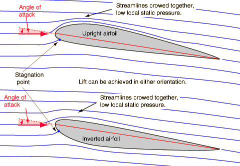Flying Upside-DownPart of the fascination of an aerobatics display is that with loops and upside-down flight. If the greater curvature on top of the wing and the Bernoulli effect are evoked to explain lift, how is this possible? The illustrations below attempt to show that an increase in airstream velocity over the top of the wing can be achieved with airfoil surface in the upright or inverted position. It requires adjustment of the angle of attack, but as clearly demonstrated in almost every air show, it can be done. ![]() Similar sketches can show the conditions for lift on a symmetric airfoil. While the typical asymmetric shape of an airfoil make increase efficiency of lift production in its upright position, the asymmetry of the airfoil is not essential for producing lift. |