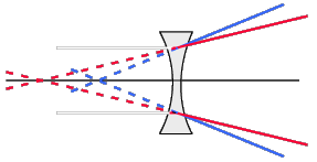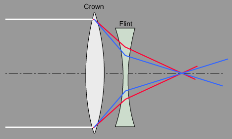 Doublet for Chromatic AberrationThe use of a strong positive lens made from a low dispersion glass like crown glass coupled with a weaker high dispersion glass like flint glass can correct the chromatic aberration for two colors, e.g., red and blue. Such doublets are often cemented together (called achromat doublets) and may be used in compound lenses such as the orthoscopic doublet.![]()