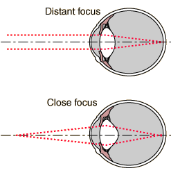 Accommodation in Eye and CameraAccommodation is the process of adjusting the focus distance of an optical instrument to the object which is to be viewed. This process is done very differently by the eye and a camera.
