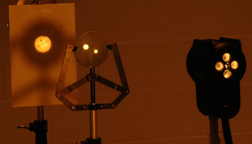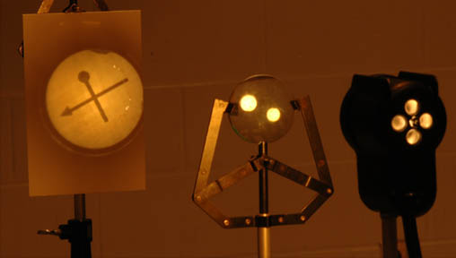 The two photographs above show conjugate images formed by a lens of focal length 15 cm. In the top photo, the object distance is 23 and the image distance 43 cm, showing a magnification of -1.9. In the bottom photo, the distances are reversed giving a magnification of -0.54 associated with the shorter image distance.