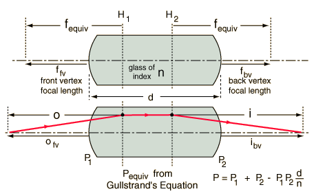 Image from Principal PlanesThe thin lens equation can be used with thick lenses if the principal planes are found. The equivalent focal length of the thick lens can be found from Gullstrand's equation, and the front and back vertex focal lengths obtained. Once that is done, the principal planes can be located by subtracting the vertex focal lengths from the equivalent focal length. The equivalent focal length and the distance from first principal distance H1 to the object can be used to calculate the image distance from the second principal plane H2. From that distance, the image distance from the back vertex can be deduced. ![]() Note that the calculation below does not take into account the change in lens thickness with the angle of the incoming ray. It is typical to do the calculation only for the paraxial rays where the departure from full thickness is negligible. The segments in boxes below are the limiting cases where the lens thickness is taken as zero (thin lens approximation).