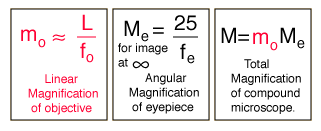 You can get more magnification from the microscope by focusing it so that the virtual image is at 25 cm rather than infinity, but it is not a good idea because it puts the eye of the viewer under strain to accommodate the eye to that close distance. The relaxed eye is focused at infinity, so if you are going to use a microscope all day, you had better focus it at infinity. Focusing the image close to the eye just because the image is slightly larger is the common mistake made by newcomers in the biology lab, which results in a very fatigued eye after an hour of viewing. |