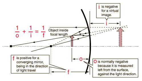Concave Mirror ImageIf an object is placed inside the focal length of a concave mirror, and enlarged virtual and erect image will be formed behind the mirror. ![]()