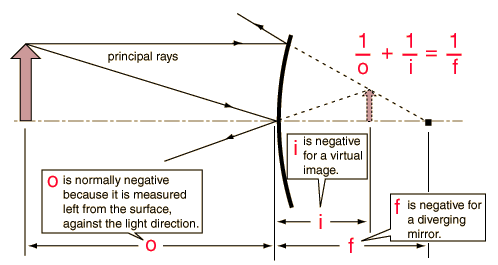 Convex Mirror ImageA convex mirror forms a virtual image. ![]() Using a ray parallel to the principal axis and one incident upon the center of the mirror, the position of the image can be constructed by back-projecting the rays which reflect from the mirror. The virtual image that is formed will appear smaller and closer to the mirror than the object.