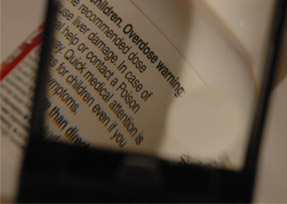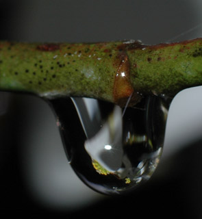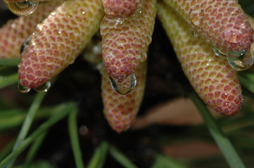 A water droplet can act as a simple magnifier and magnify the object behind it. Water tends to form spherical droplets under the influence of surface tension. When attached to an object like these examples, the spherical shape is distorted, but still capable of forming an image. Above the droplets are on tiny emerging pine cones. At left the droplet forms a partial image of the flower that is out of focus behind it.