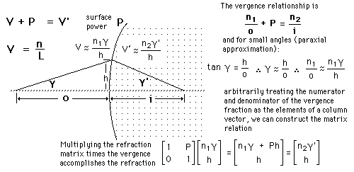 Refraction MatrixThe use of vergence to describe the refraction at an interface can be used as a starting point for developing a matrix to perform the refraction. ![]() |
