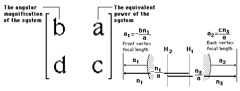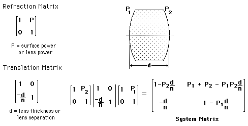 System MatrixFor systems of multiple thick lenses, it is sometimes useful to represent the system by a system matrix. The matrix is built up by multiplying the refraction matrices and translation matrices. The positions of the principal planes, the front and back surface powers, and the equivalent focal length of Gullstrand's equation can be calculated from the system matrix. ![]() This is the form of the system matrix used by Meyer-Arendt. An alternate form is used by Hecht.