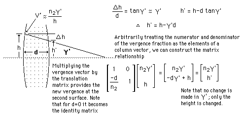 Translation MatrixThe geometry of translation across the thickness of a lens can be put in matrix form for rays satisfying the paraxial approximation. ![]() |