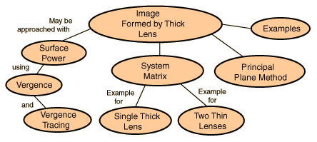 Thick Lens ImagingThe thin lens equation cannot be used directly to find images formed by thick lenses. Even when Gullstrand's equation is used to find the equivalent power of the thick lens, that power is with respect to a principal plane . The thickness of the lens alters the image position and the center of the thick lens cannot in general be used as the lens position. Three methods are presented for finding the image formed by a thick lens. ![]() |