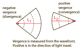 VergenceThe vergence of light is defined by where n is the index of refraction of the medium and L is the distance in accordance with the Cartesian sign convention.