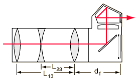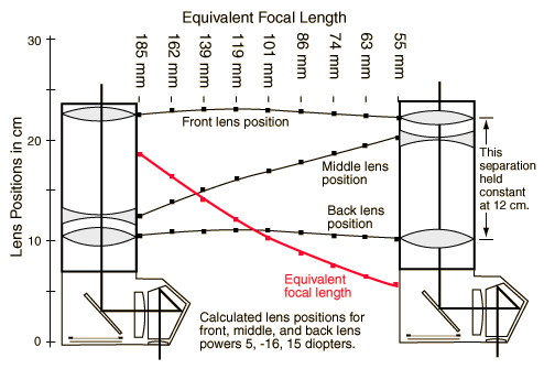 True Zoom Telephoto LensIn a true zoom lens, two or more of the lens elements are moved within a fixed tube to change the focal length while keeping the image in focus on the film. One scheme with the triplet arrangement shown below is to keep the front and back elements at a fixed separation and move them and the center element to accomplish the zoom. ![]() middle lens focal length = and back lens focal length = , the equivalent focal length is . Front to back lens distance = Middle to back lens distance = Back lens to film distance = Calculation to be added.
