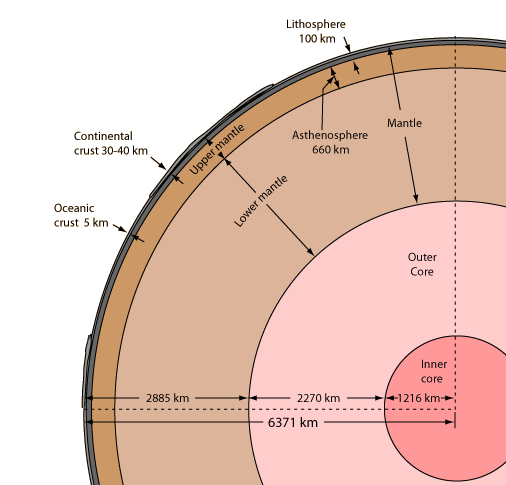 Structure of the EarthThe illustration below is an attempt to model the large scale internal structure of the Earth based on data from Lutgens & Tarbuck. The habitable part of the Earth is a very thin layer. Though one might quibble with the precision, the following captures the perspective "all life is confined to the space between the snow of the mountain tops and the heat of the Earth's interior. This narrow stratum as compared with the diameter of the Earth is but one half the thickness of one leaf of a thousand-page book." (Morrison) ![]()