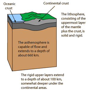 The continental crust is made up of lighter granitic rock, while deep-sea drilling reveals that the oceanic crust is basaltic in composition. Basalt is significantly more dense (about 3 gm/cm3) than granite (about 2.6 gm/cm3). The asthenosphere is thought to be a more dense rock like peridotite. This judgement comes from the fact that lava reaching the surface in volcanic activity comes from the melting of the upper asthenosphere. Lava of similar composition can be obtained by melting peridotite. Modeling the core of the Earth must rest upon even more indirect evidence. We observe that the metallic meteorites have cores of iron and nickel, and this correlates with other evidence that suggests that the Earth's core is similarly composed of iron and nickel. Modeling the density of the center of the Earth yields densities of about 14 times that of water, which could be obtainable by compressing iron and nickel, but not surface type rocks. An iron core also gives us a circulating electrical conductor, which could provide the necessary mechanism for creating the Earth's magnetic field. The following table of density and depth data was taken from a USGS publication by Eugene C. Roberson entitled The Interior of the Earth. (http://pubs.usgs.gov/gip/interior/)