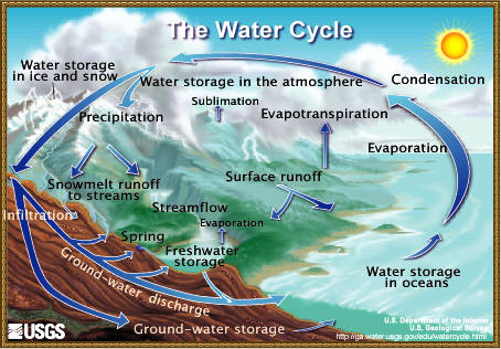 OceansWater is evaporated from the oceans and the land and returned as rain or snow, forming the hydrologic cycle. ![]() "The water cycle sounds like it is describing how water moves above, on, and through the Earth ... and it does. But, in fact, much more water is "in storage" for long periods of time than is actually moving through the cycle. The storehouses for the vast majority of all water on Earth are the oceans. It is estimated that of the 332,500,000 cubic miles (mi3) (1,386,000,000 cubic kilometers (km3)) of the world's water supply, about 321,000,000 mi3 (1,338,000,000 km3) is stored in oceans. That is about 96.5 percent. It is also estimated that the oceans supply about 90 percent of the evaporated water that goes into the water cycle."(USGS)