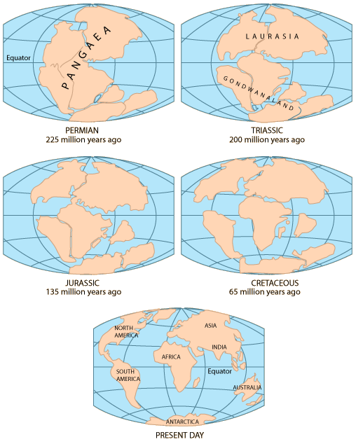 Plate TectonicsThe rocky mountains seem high and solidly fixed, but their height is a tiny fraction of the Earth's radius, and they sit atop a likewise thin solid crust on the Earth. Evidence has mounted that sections or "plates" of this solid crust move with time and have made dramatic movements during the time that life has existed on the Earth. ![]() Below is a set of sketches of continent outlines modeled after the USGS site, giving a view of the postulated movements of the continental plates. A major work called The Dyamic Earth is available through the U.S. Geological Survey : http://pubs.usgs.gov/gip/dynamic/dynamic.html . The names Pangaea for the supercontinent and Laurasia and Gondwanaland for the stage after breakup date back to the time of Wegener. ![]()