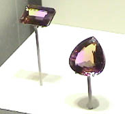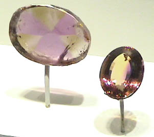 Quartz is silicon dioxide, SiO2. Quartz is abundant in the Earth's crust, being the chemically simplest form of the silicates. All the samples here are displayed in the Smithsonian Museum of Natural History. Ametrine quartz is one of the noted varieties of quartz, and is often of gem quality. The gem at right is 138.7 carats from Anahi mine, Santa Cruz, Bolivia. The sample beside it is is about 3x2.5 cm in size. |  |