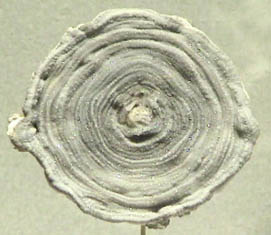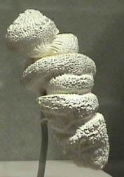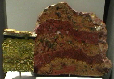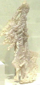 Quartz is silicon dioxide, SiO2. Quartz is abundant in the Earth's crust, being the chemically simplest form of the silicates. All the samples here are displayed in the Smithsonian Museum of Natural History. One of the names applied to quartz is chalcedony. It is not a specific name and has been used for a variety of types of quartz. It is used here following the usage at Smithsonian to describe those types of quartz which were formed in an apparent tubular formation, like multiple flows or stalactite forms. The sample at right is about 10x35 cm and is from Namibia.