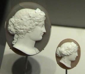 Quartz is silicon dioxide, SiO2. Quartz is abundant in the Earth's crust, being the chemically simplest form of the silicates. All the samples here are displayed in the Smithsonian Museum of Natural History. One of the distinctive varieties of quartz is called onyx. The samples at right have a maximum dimension of about 3.5 cm and are from Brazil.