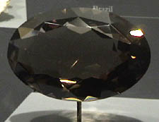 Quartz is silicon dioxide, SiO2. Quartz is abundant in the Earth's crust, being the chemically simplest form of the silicates. All the samples here are displayed in the Smithsonian Museum of Natural History. Smoky quartz is one of the noted varieties of quartz, and is often of gem quality. The gem shown at right is 144.9 carats and is from Scotland. |  |