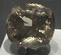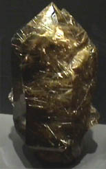 | This is quartz with rutile. The mineral sample is about 8x18 cm and is from Itabiara, Bahia, Brazil. The 2670 carat gem is from Minas Gerais, Brazil. It appears to be about 7 cm across.  |