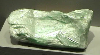 Talc is a soft mineral, measuring about 1 on the Mohs hardness scale. The softest of the common minerals, it can be scratched with a fingernail. This sample is on display at the Smithsonian Museum of Natural History.