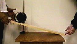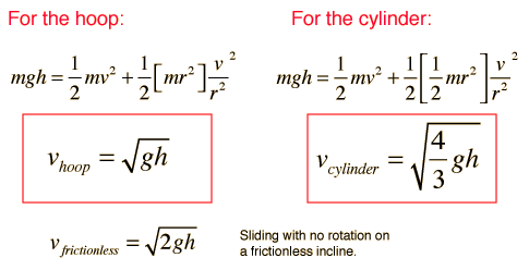 Hoop and Cylinder MotionGiven a race between a thin hoop and a uniform cylinder down an incline, rolling without slipping. Which will win? ![]() Mass and radius cancel out in the calculation, showing the final velocities to be independent of these two quantities.