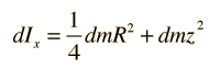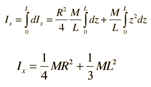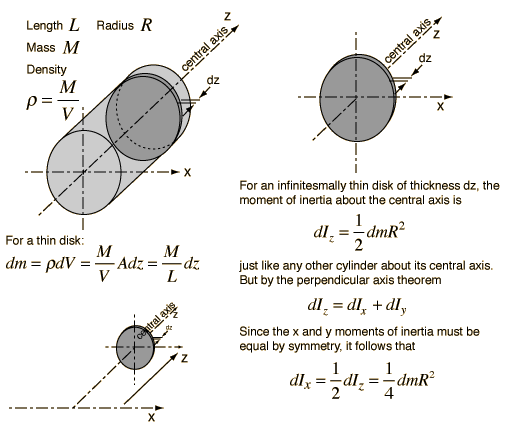 The development of the expression for the moment of inertia of a cylinder about a diameter at its end (the x-axis in the diagram) makes use of both the parallel axis theorem and the perpendicular axis theorem. The approach involves finding an expression for a thin disk at distance z from the axis and summing over all such disks.