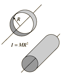 The moment of inertia of a hoop or thin hollow cylinder of negligible thickness about its central axis is a straightforward extension of the moment of inertia of a point mass since all of the mass is at the same distance R from the central axis.