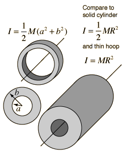 This may be compared with a solid cylinder of equal mass where I(solid) = kg m2, or with a thin hoop or thin-walled cylinder where I(thin) = kg m2.